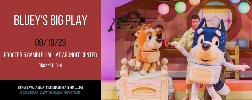 You can buy Procter & Gamble Hall at Aronoff Center Bluey's Big Play tickets easily by going to TicketSqueeze.com or by clicking the "Buy Tickets" button on this page. Alternatively you can visit the Procter & Gamble Hall at Aronoff Center Box Office directly, or call them on (513) 721-3344.
