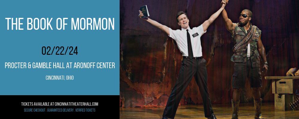 If you are tired of wasting your Thursday evenings at home, then the iconic Procter & Gamble Hall at Aronoff Center has an amazing alternative. Because on Thursday 22nd February 2024, The Book of Mormon is coming to Cincinnati, Ohio for a stunning show. You’ll also be able to find out what all the buzz is about, and see the show that was winner of multiple Tony Awards as well as a Grammy Award, and the musical that is smashing box office records! Even if you’ve never been to this show before, we know that you’ll find a lot to love! Don’t miss out on watching The Book of Mormon at the Procter & Gamble Hall at Aronoff Center on Thursday 22nd February 2024, because if you cherish theatre, then you owe it to yourself to see the excitement and thrills first-hand. To get your tickets today, click the Buy Tickets button below.